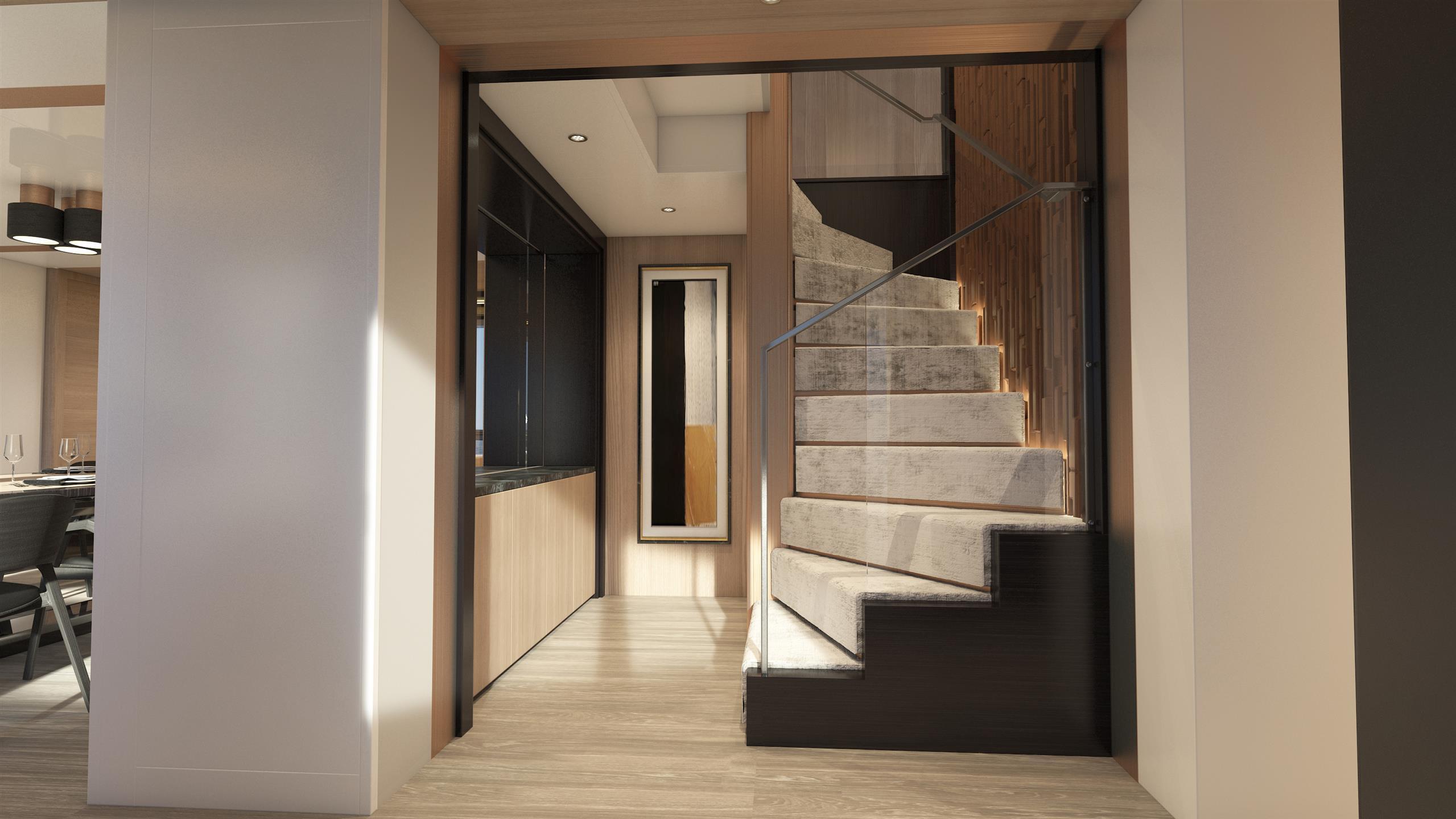 Създавайки важно първо впечатление, просторното фоайе приветства гостите на борда чрез двойни врати от десния борд до средата на яхтата. Вътре, забележително стълбище пресича всички етажи, което позволява достъп до основния салон и зоните за хранене на кърмата и каютите за капитан и гости отпред , Откъм левия борд, страничната палуба и страничните врати на двете главни палуби могат да се използват специално от екипажа, като по този начин се осигурява уединението на собственика и гостите на яхтата.